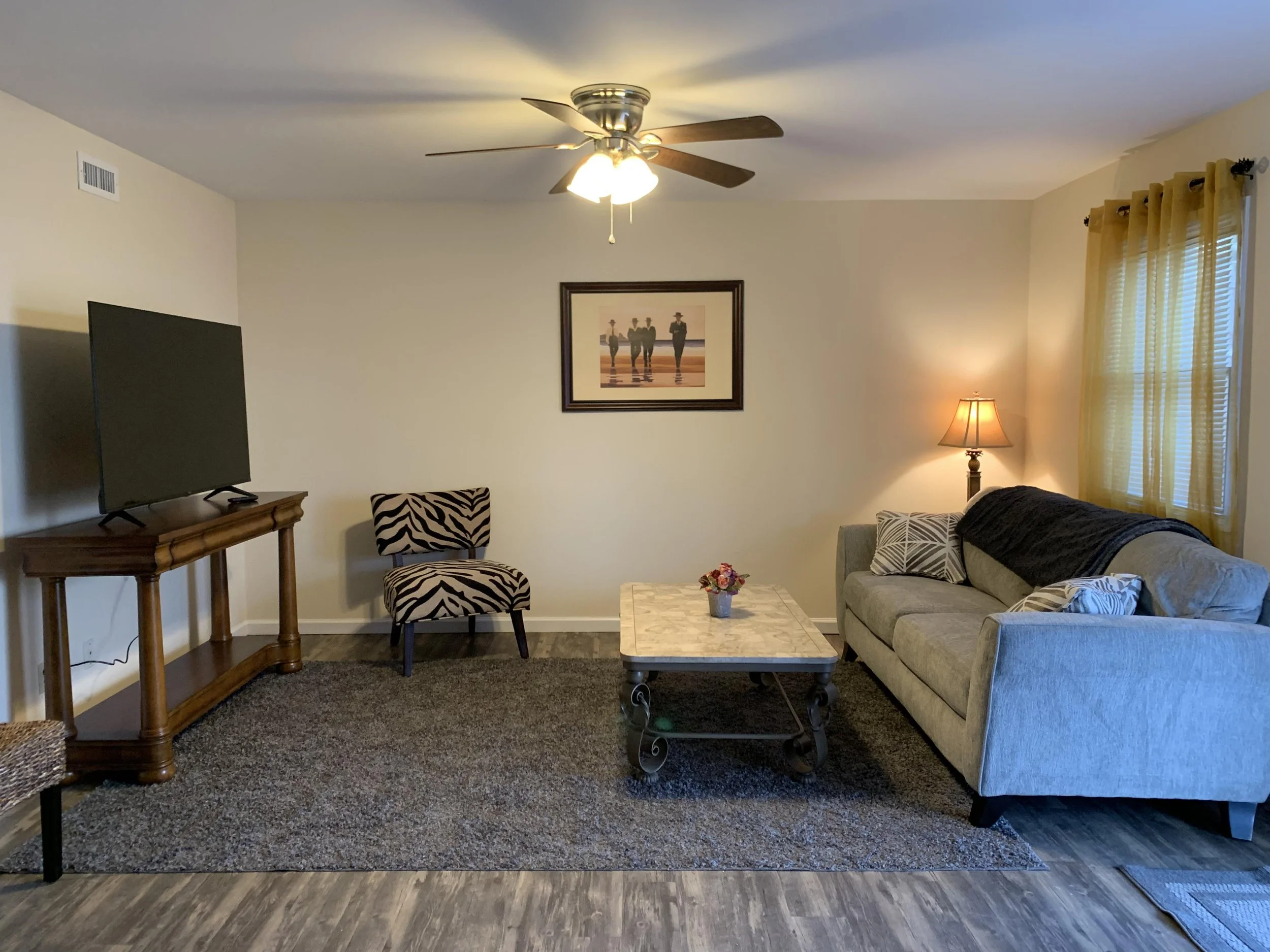 The living room is designed with comfort in mind, featuring a ceiling fan and cozy seating arrangements. The open floor plan connects the living area to the kitchen, creating a warm and welcoming environment for relaxation or entertaining.