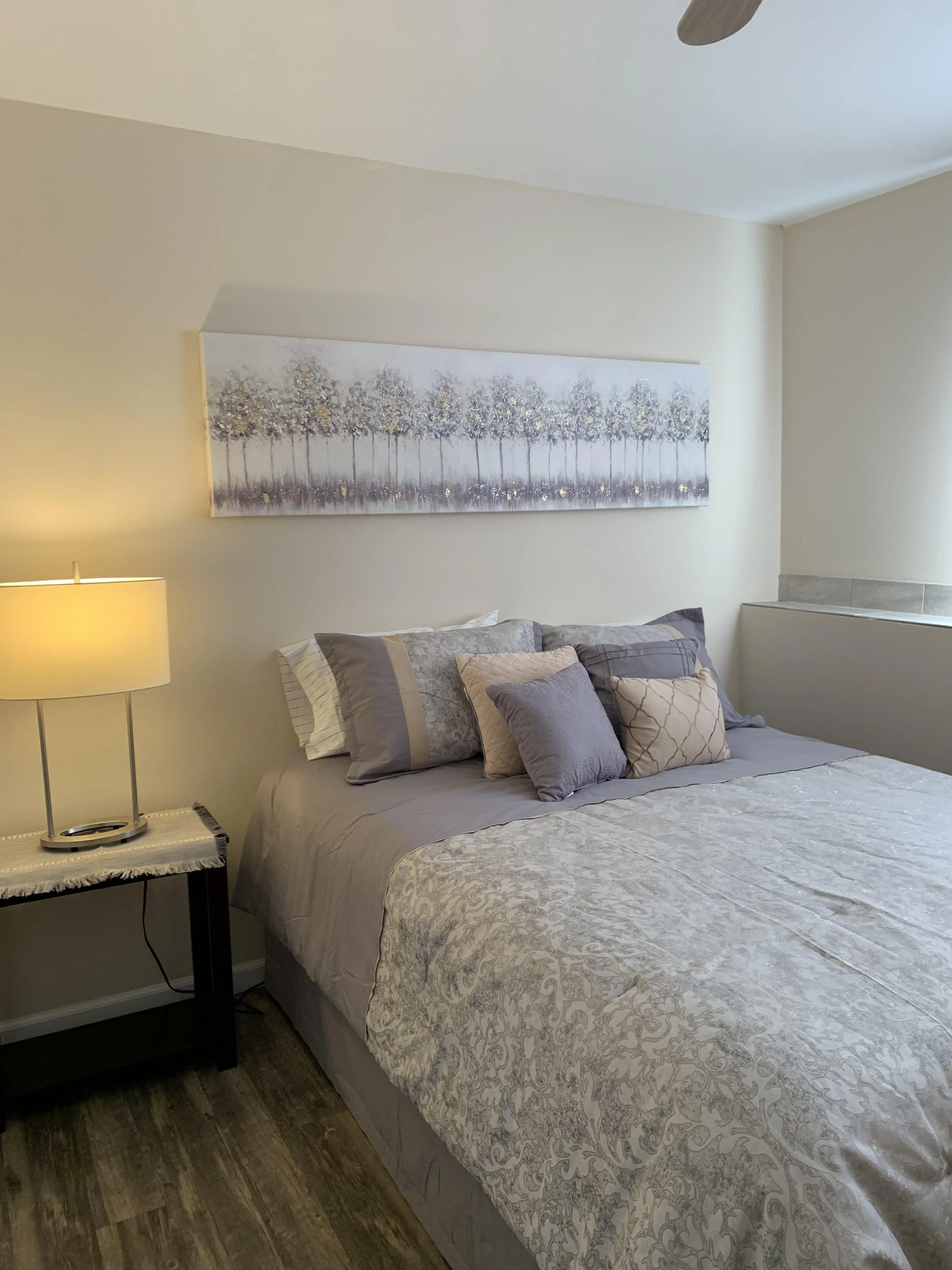 This cozy bedroom includes a spacious closet with sliding doors and a ceiling fan for added comfort, perfect for storage and relaxation.