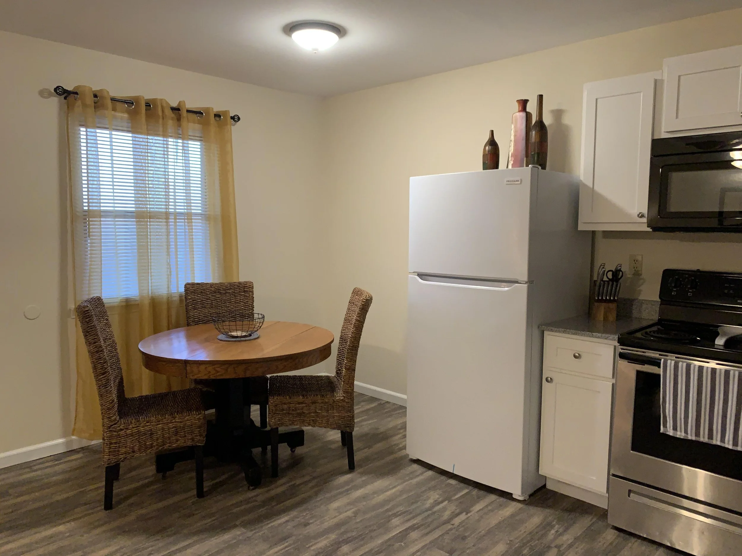 This cozy kitchen features a full-sized refrigerator and open dining space with room for a small table, perfect for intimate meals. The open floor plan allows for easy movement between the kitchen and living spaces.