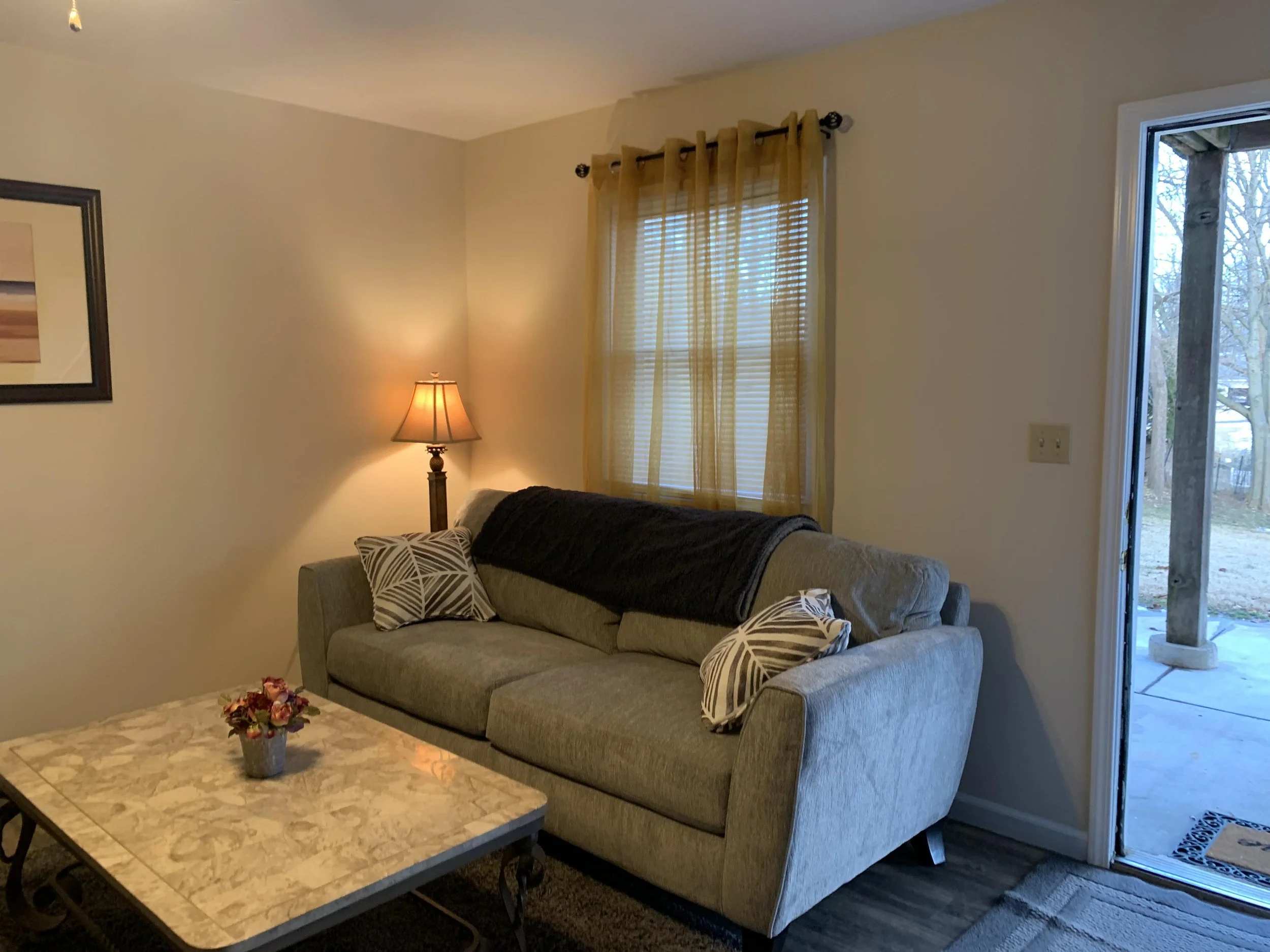 Another angle of the living room highlights the natural light coming through the windows and the well-placed lighting for a cozy ambiance. The layout is perfect for creating a relaxing and inviting space.