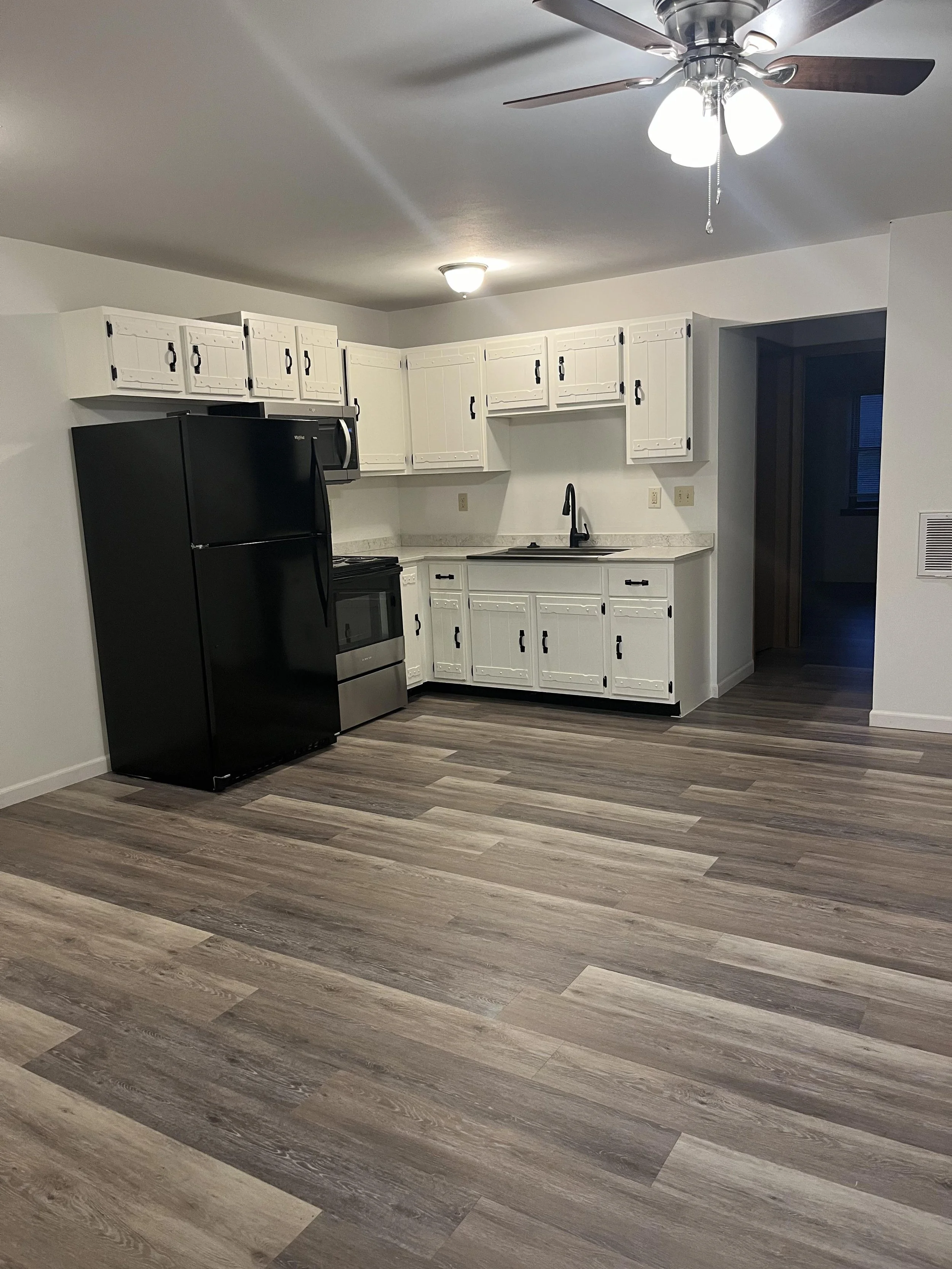 Modern kitchen featuring white cabinetry, black appliances, and gray flooring for a sleek, airy look.
