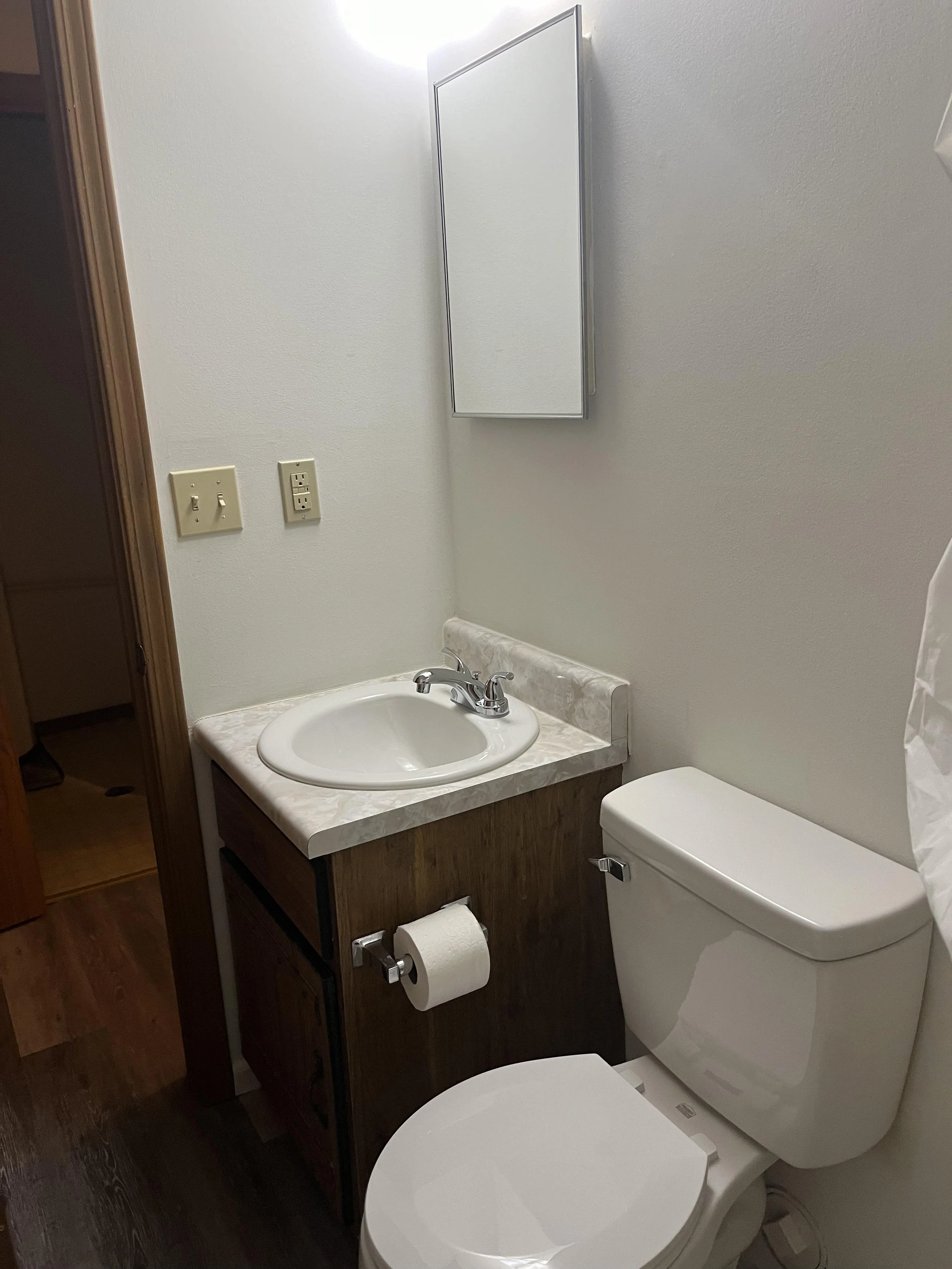 Simple bathroom with a wood-toned vanity, compact sink, and neutral white walls for a functional setup.