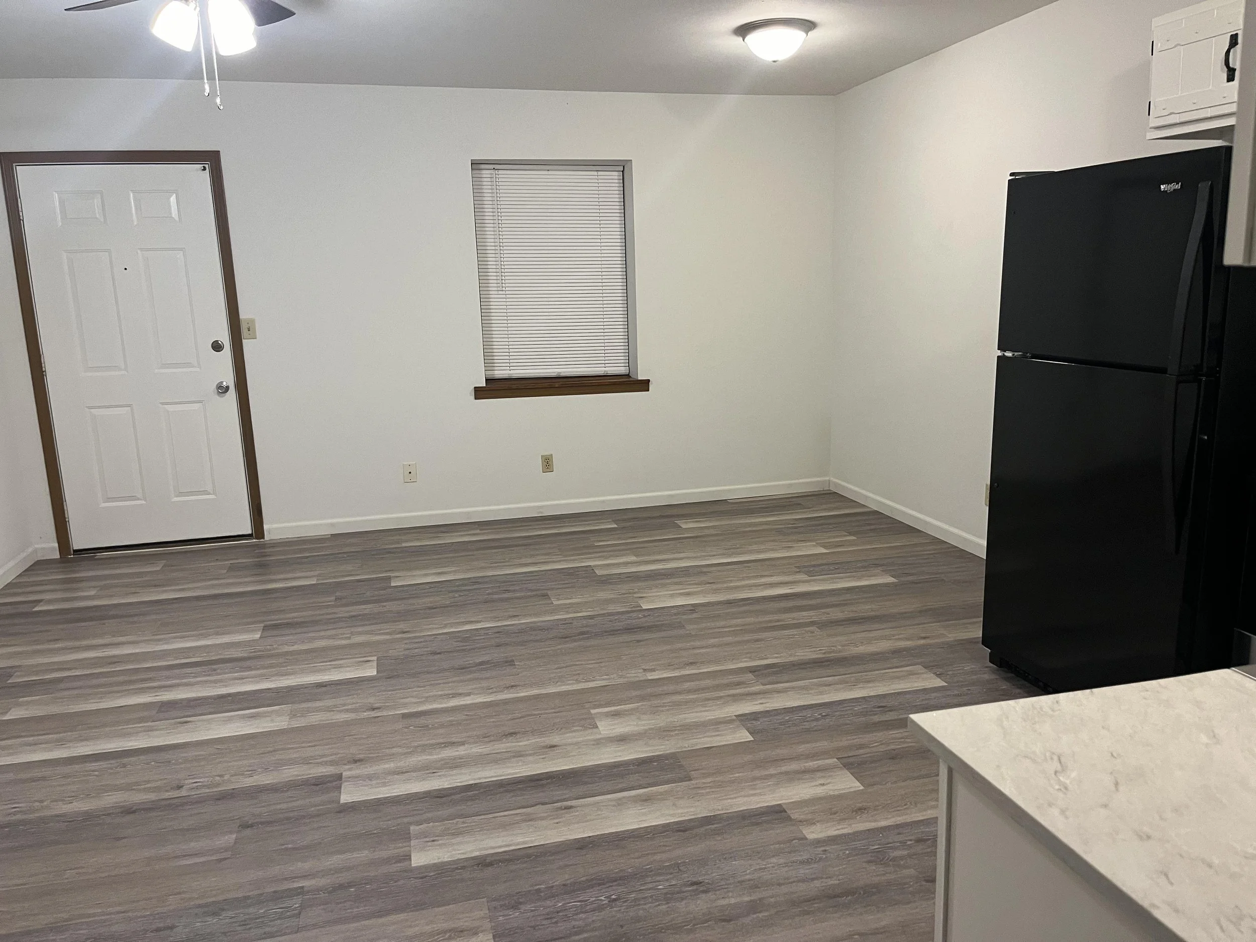 Cozy living area with natural light, a ceiling fan, and ample floor space for versatile furniture arrangements.