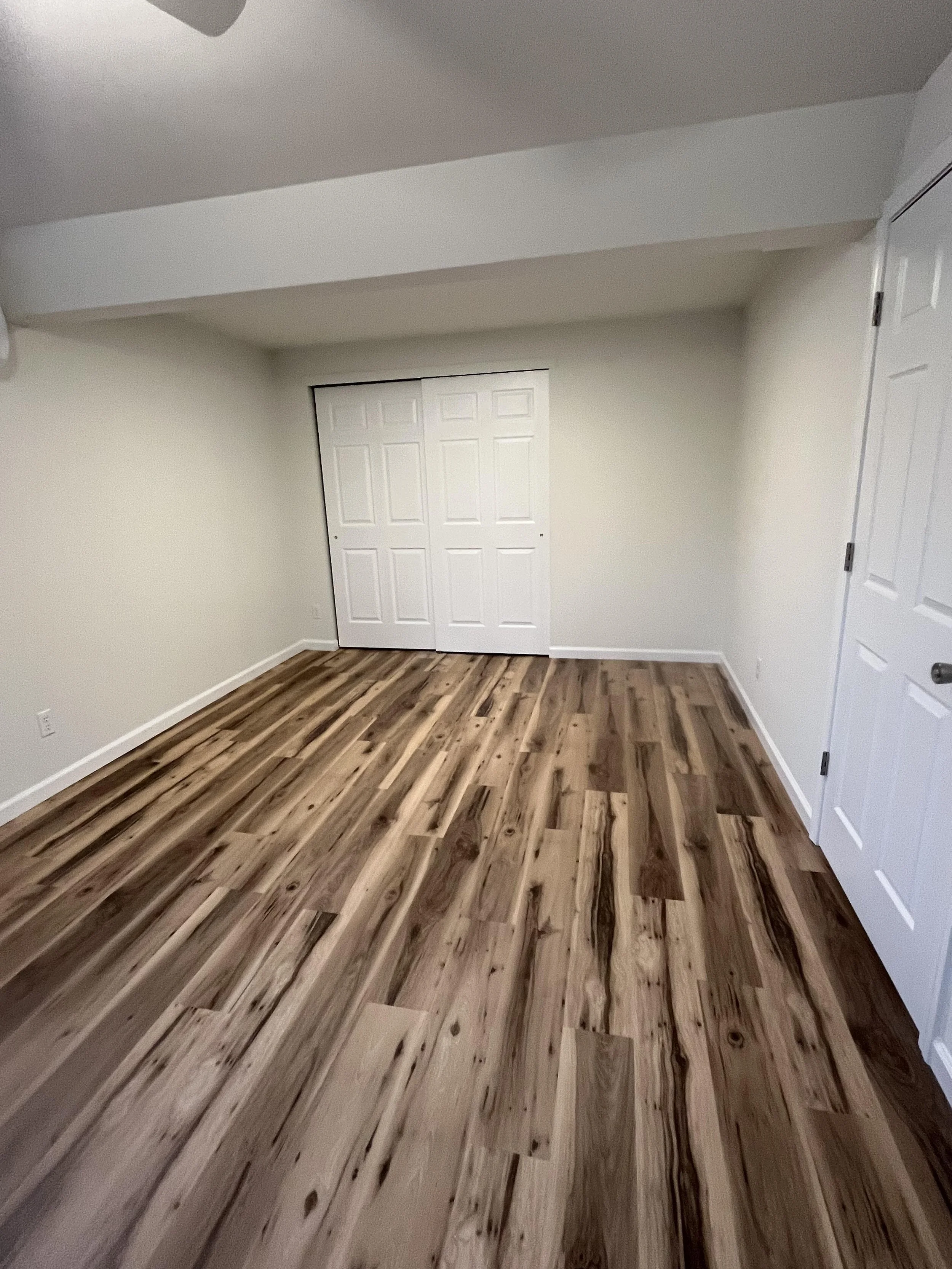The bedroom offers a cozy space with natural light, a ceiling fan, and wood-style flooring. A large closet provides plenty of storage.