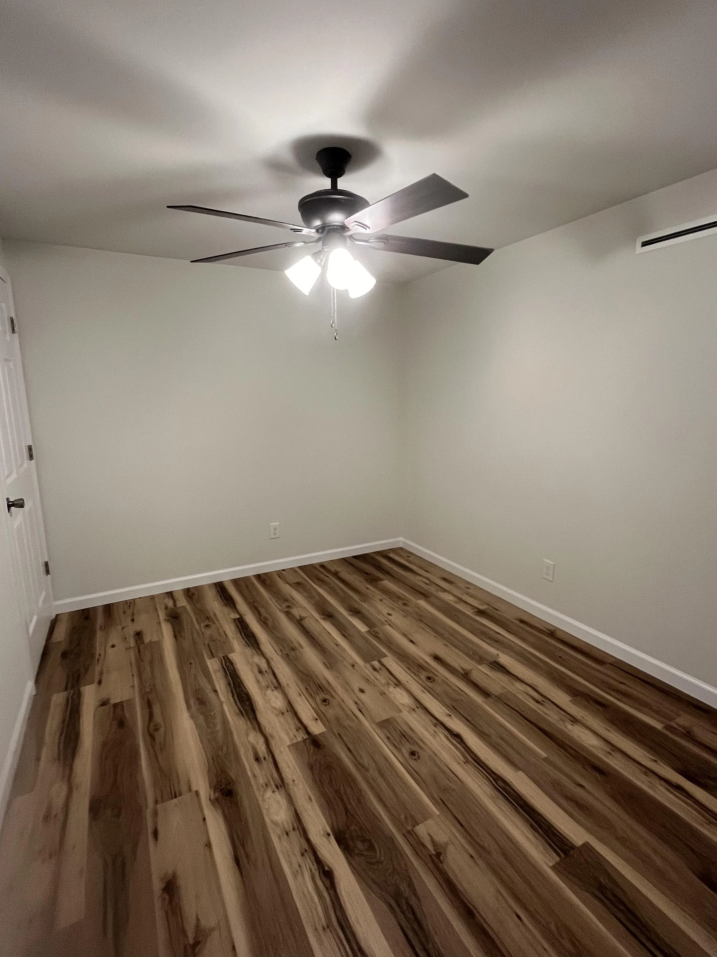 This alternate view of the bedroom shows the ample space and clean design, complete with a ceiling fan and large window. Perfect for rest and relaxation.