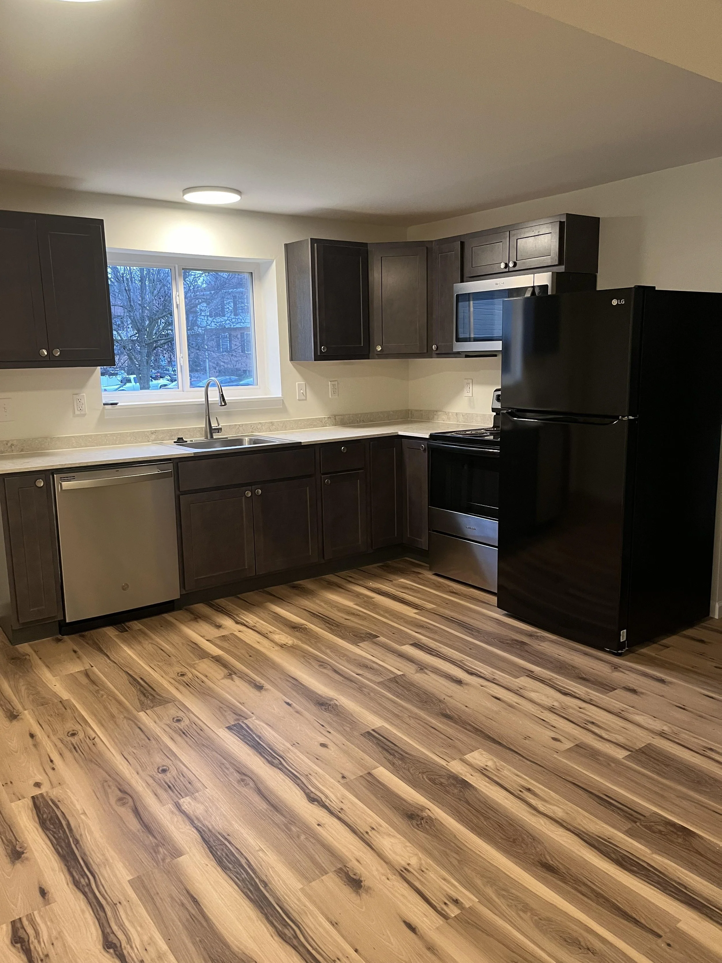 This modern kitchen features sleek black appliances, dark cabinetry, and ample counter space, perfect for cooking. The wood-style flooring and large window give the space a bright and open feel.