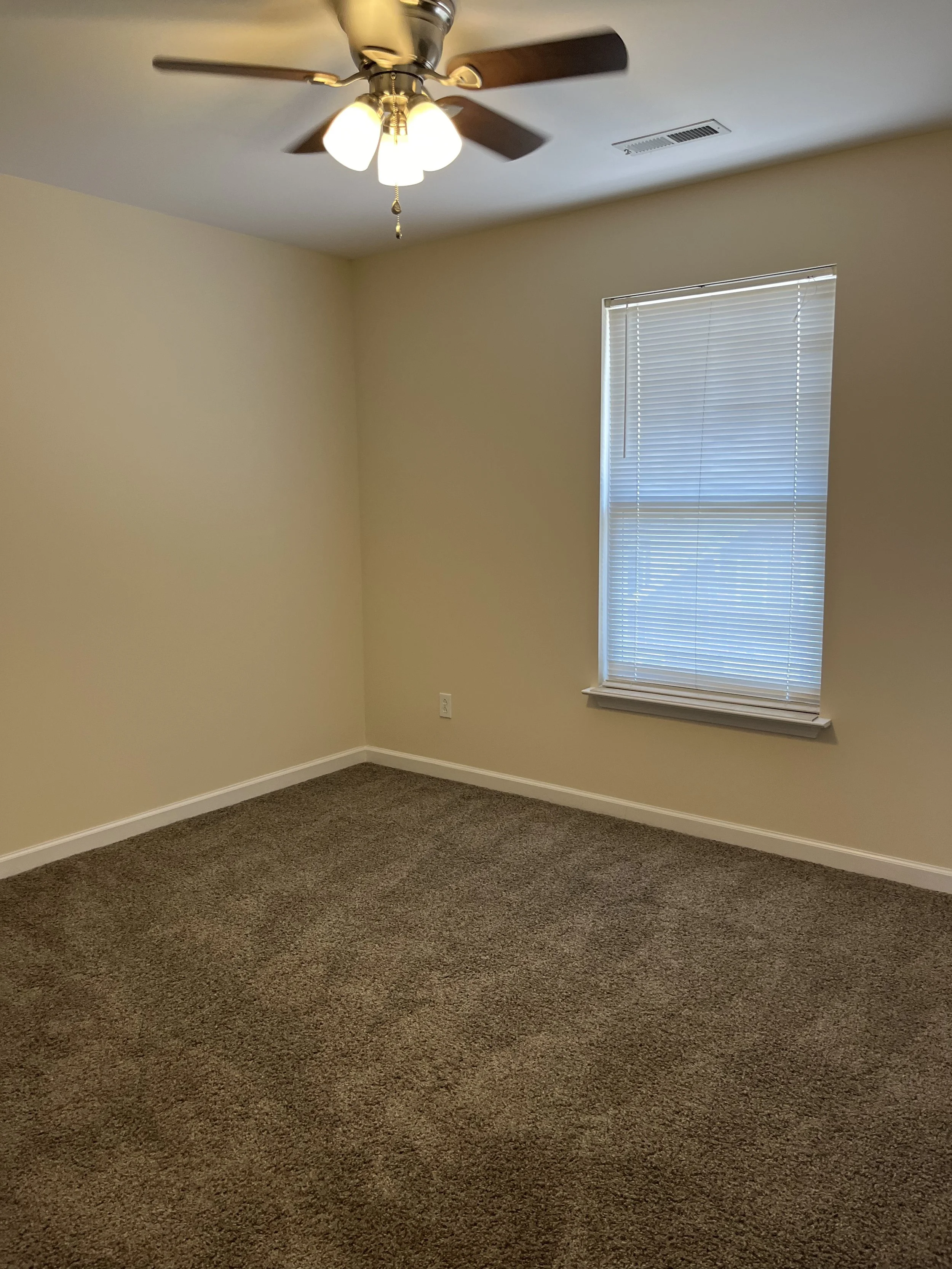 This cozy bedroom features soft carpet flooring and plenty of natural light, creating a comfortable space ideal for a guest room or home office.