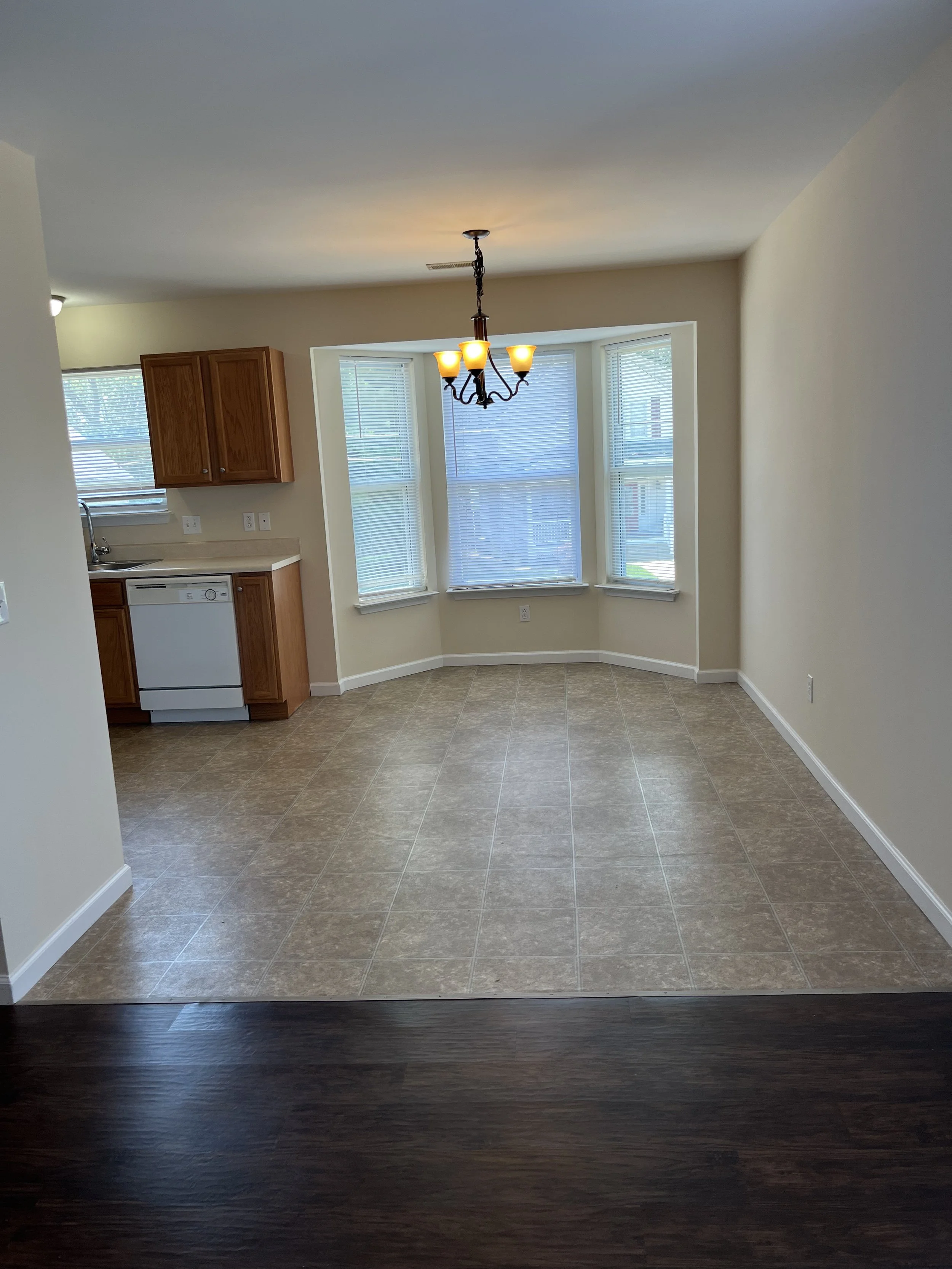 This dining room offers ample space for family meals and entertaining, highlighted by a charming bay window that adds character and brightness to the room.