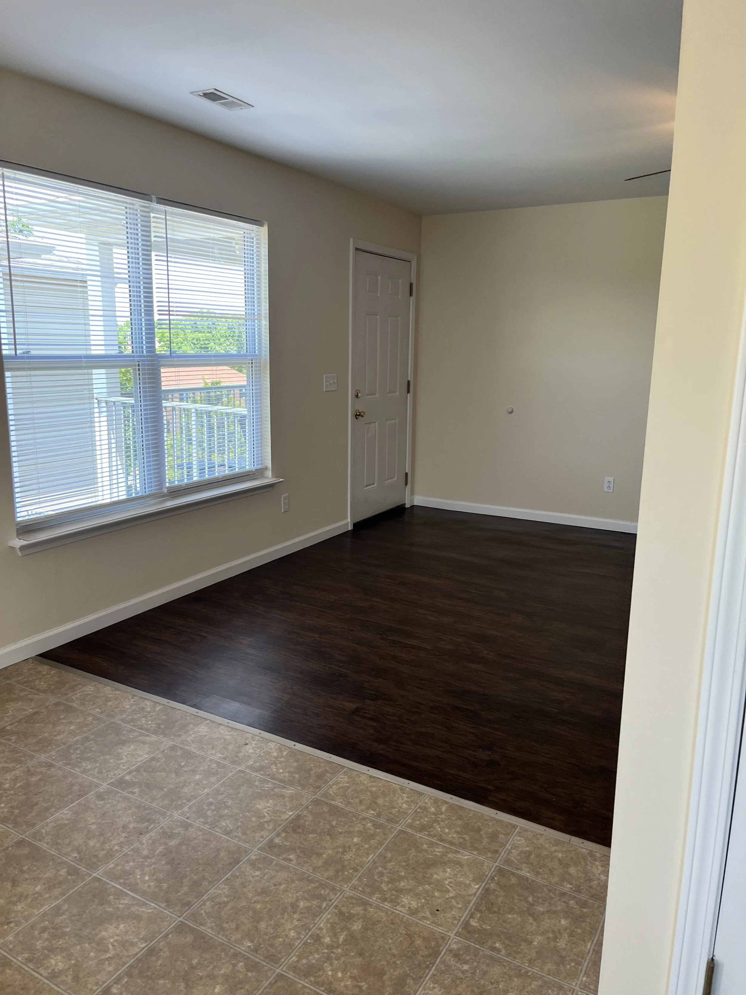 This space combines the dining area and entryway, with large windows letting in natural light and a smooth transition between tile and wood-style flooring.
