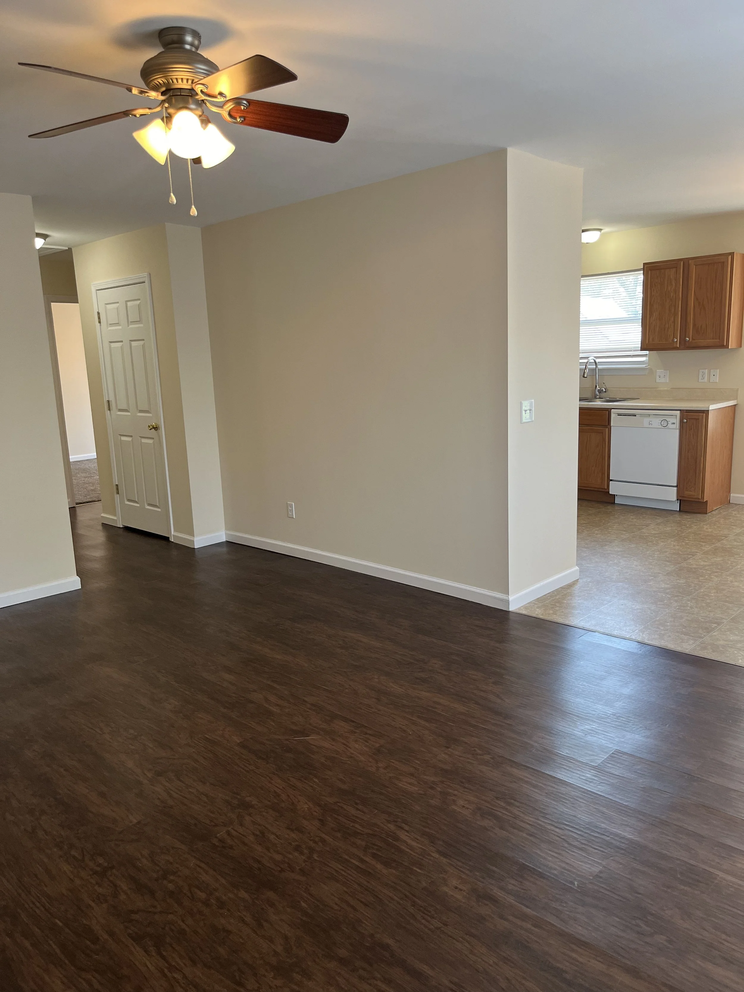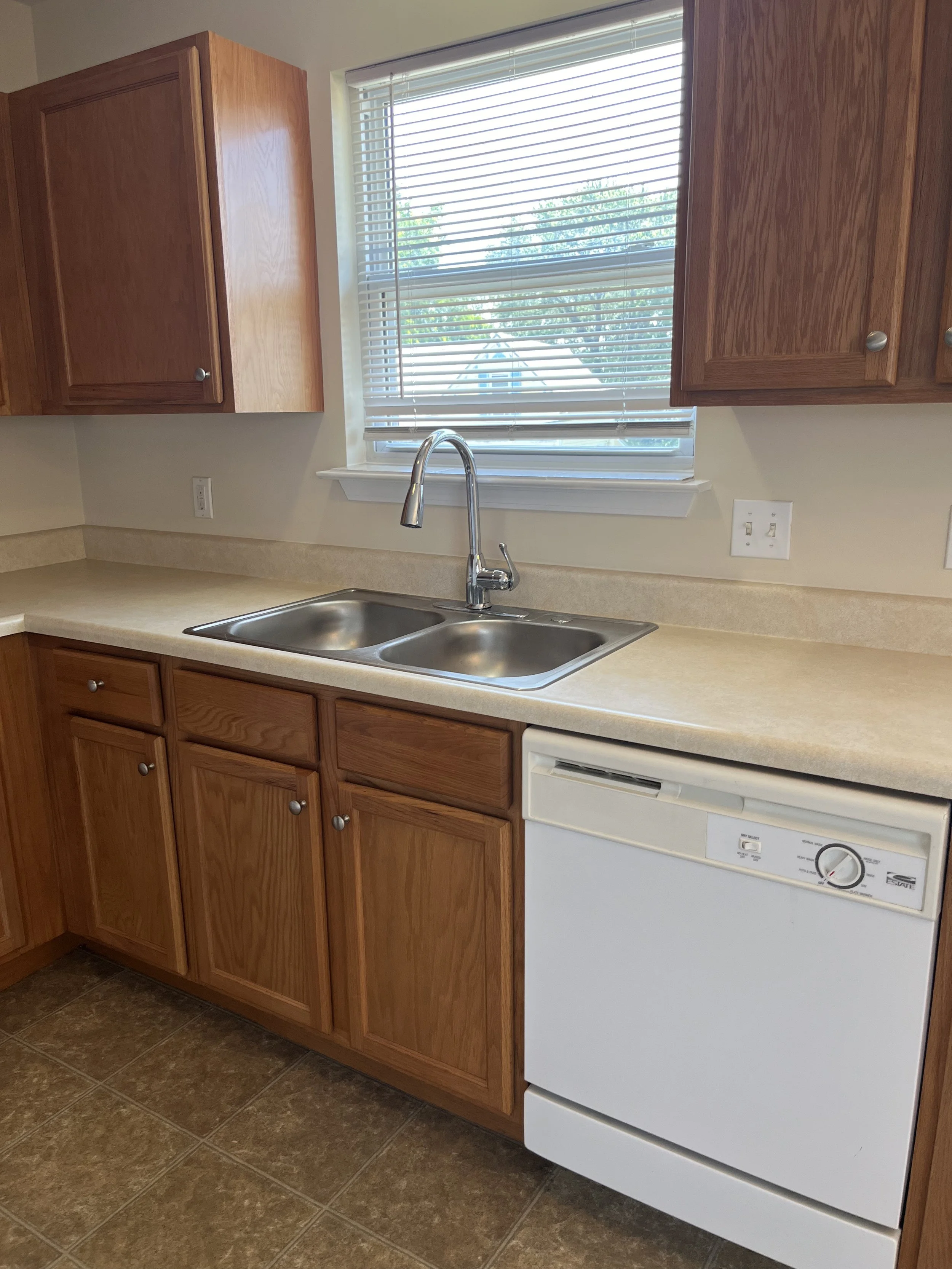 The kitchen features modern wood cabinetry, a double sink, and a dishwasher, offering a clean and functional space perfect for everyday meal preparation.